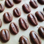 - Kuvertüre mit Kokosfett im Wasserbad schmelzen und die Kaffeebohnen 1/3 eintauchen. Auf Backpapier legen und trocknen lassen