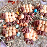 - Jedes Schäfchen besteht aus 9 Kugeln a 2-3 g. Die 10.Kugel über dem Kopf etwas kleiner formen. Aus dem dunklen Teig Kopf, Ohr, Schwanz und Füsse formen und den Mund einschneiden. Das Auge habe ich mit einem Holzstäbchen eingedrückt, ebenso das Ohr.