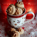 Kirschgrosse Kugeln formen und auf ein mit Backpapier ausgelegtes Backblech legen. Eine Walnusshälfte leicht oben andrücken.