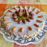 - Puderzucker mit so viel Zitronensaft verrühren dass ein zäher Guss entsteht und die Rübli-Torte komplett mit Rand überziehen. Sofort am Rand die Mandelblättchen anbringen.