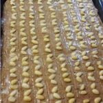 5. Bei 175 Grad 30-35 Minuten je nach Backofen backen. Auskühlen lassen und Quadrate komplett noch lauwarm schneiden. Am besten in einer Tupperschüssel aufbewahren, da bleibt der Honigkuchen weich und saftig.
