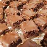 - Kuvertüre schmelzen und auf den Brownies verteilen und glatt streichen. (Ich werde sie dieses Jahr ohne Glasur in Quadrate schneiden und komplett in die Kuvertüre tauchen das macht sie länger haltbar.) In ca 3×3 cm grosse Quadrate schneiden und nach Wunsch mit